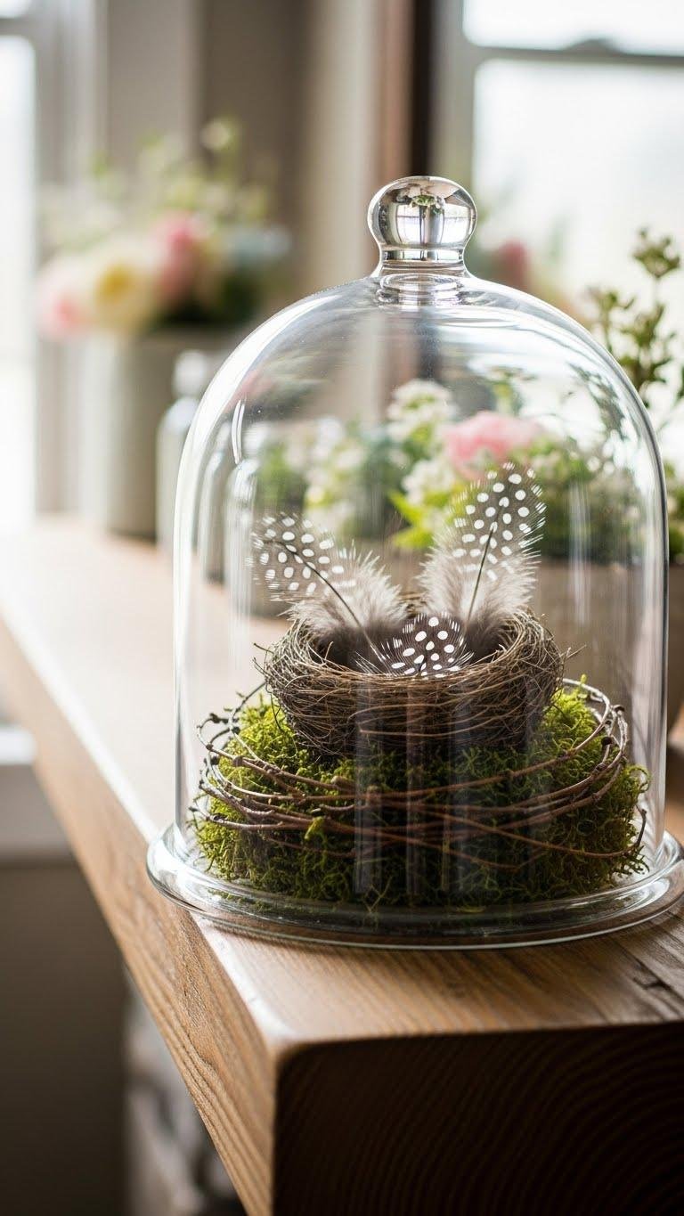 Tucked beneath a glass cloche, a small bird’s nest becomes an instant vignette that feels both curated and effortlessly collected—place it on a mantel, open shelf, or your spring table to add a whisper of nature and nostalgia.