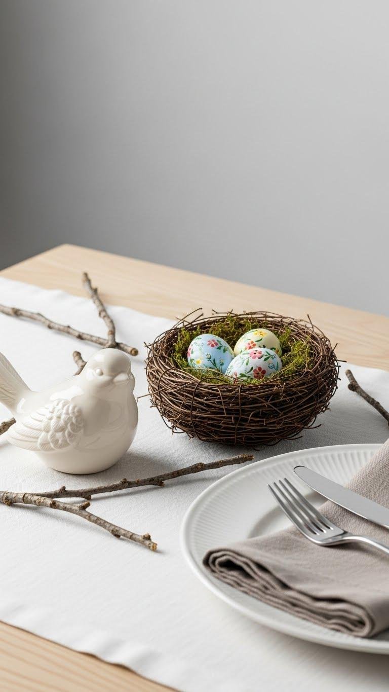 Bring a soft, artisanal touch to your spring table with a ceramic bird perched beside a tiny, handcrafted nest—it anchors the vignette while keeping the look clean and modern.