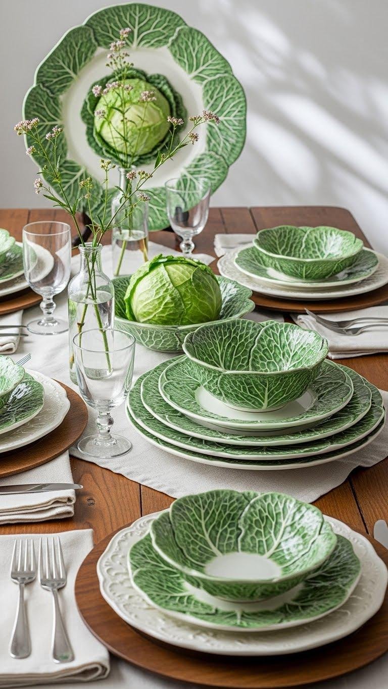 Lean into the charm of cottage cabbage dinnerware by arranging a few plates and bowls so their hand-painted greens and scalloped edges peek through layered linens and natural wood—this display feels lived-in but intentional. You’ll pair vintage cabbageware with simple stems, nestle a small cabbage centerpiece nearby, and let imperfect stacking and soft shadows create an effortless, free-spirited table scene.