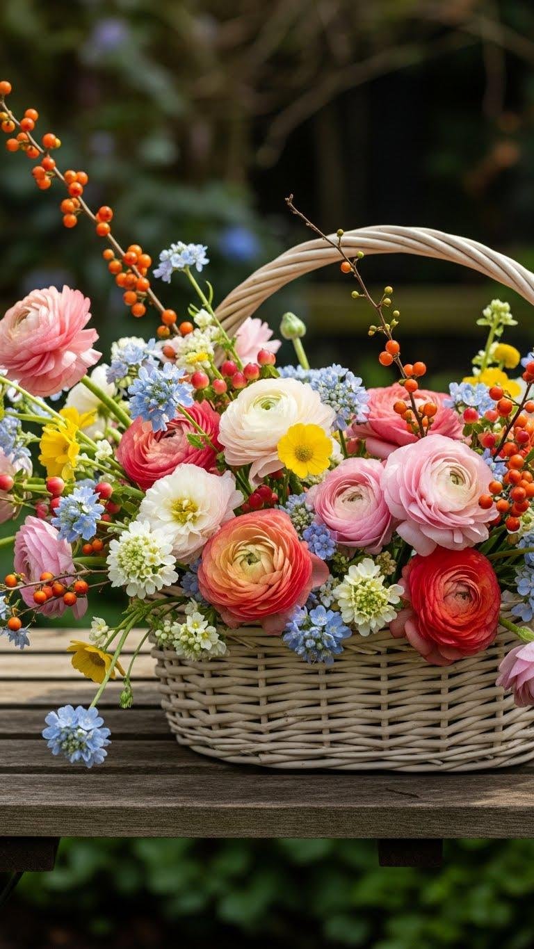After you’ve softened an urn with a petite wreath, spread that same easygoing spring energy across a wider surface by filling a woven basket with seasonal blooms. You’ll mix wildflower posies, soft ranunculus, and sprigs of painted berry stems for texture. Let stems drape and edges breathe, creating a liberated, lived-in vignette that feels fresh, curated, and effortlessly yours.