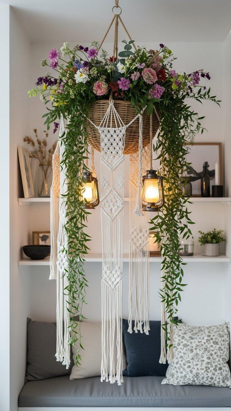 Hang a woven floral basket above a cozy nook to pull the eye upward and give the space an instant focal point.