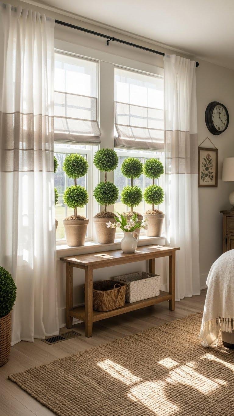 Let white sheers filter the morning light into soft pools that make your topiaries glow like living sculptures; the translucent fabric keeps the room airy while framing the structured greenery for a modern farmhouse look. You’ll layer linen panels for texture, let topiary silhouettes punctuate windowsills, and arrange pots with clean lines so you feel free, refreshed, and effortlessly on-trend each spring morning.