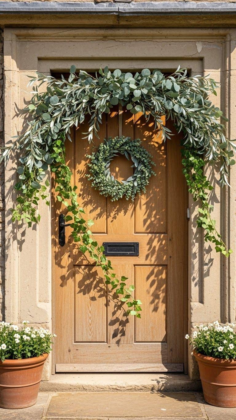 A simple swag of greenery can immediately soften a doorway and set a welcoming, springtime tone for your farmhouse—drape faux eucalyptus, olive branches, or trailing ivy across the top and let a few tendrils spill down each side.