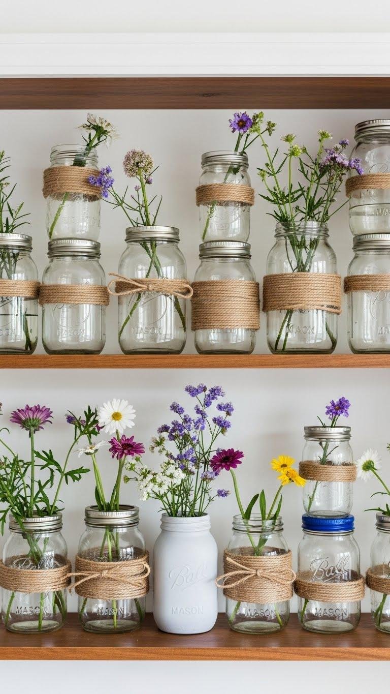 Bring out a stack of mason jars and line them up on open shelves to turn simple stems into a charming, budget-friendly focal point. You’ll wrap rustic twine around necks, mix clear and frosted glass, and add painted lids for pops of color.
