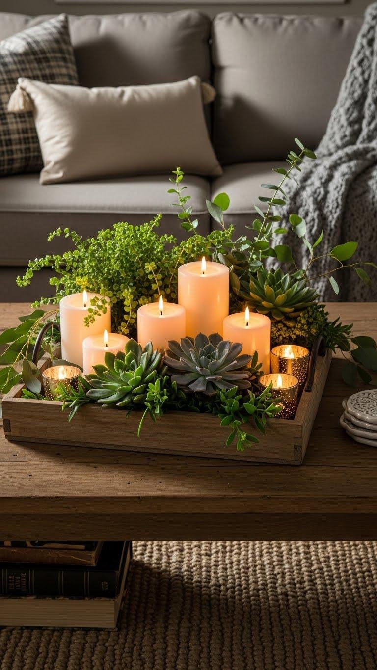 Perched on your coffee table or centered on the dining table, a wooden tray filled with greenery and candles creates an instant, grounded centerpiece that feels both rustic and refined. You’ll choose a distressed tray, layer pillar and votive candles, and nestle succulent clusters, ferns, and eucalyptus. It’s effortless, liberated styling that invites warmth, soft light, and a fresh, lived-in elegance.