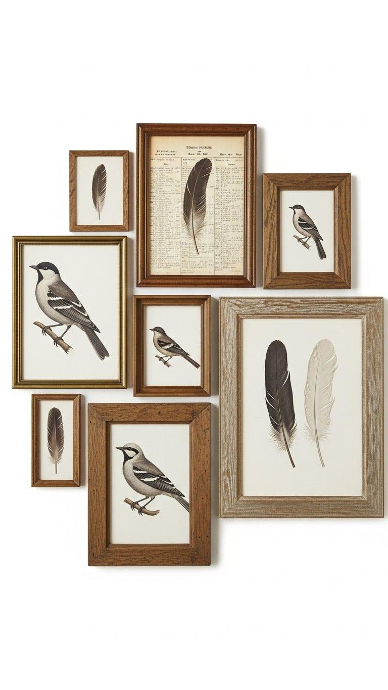 You’ll pair crisp feathered silhouette studies with an open antique ledger page as backdrop, balancing scale and negative space. Hang slightly askew for freedom-loving charm and effortless, trend-savvy appeal.