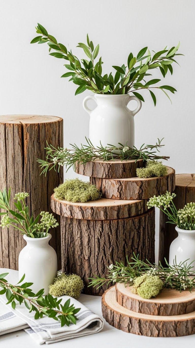 With layered wood rounds and sprigs of greenery, you can build a vignette that feels both rustic and polished, letting texture do the decorating for you.