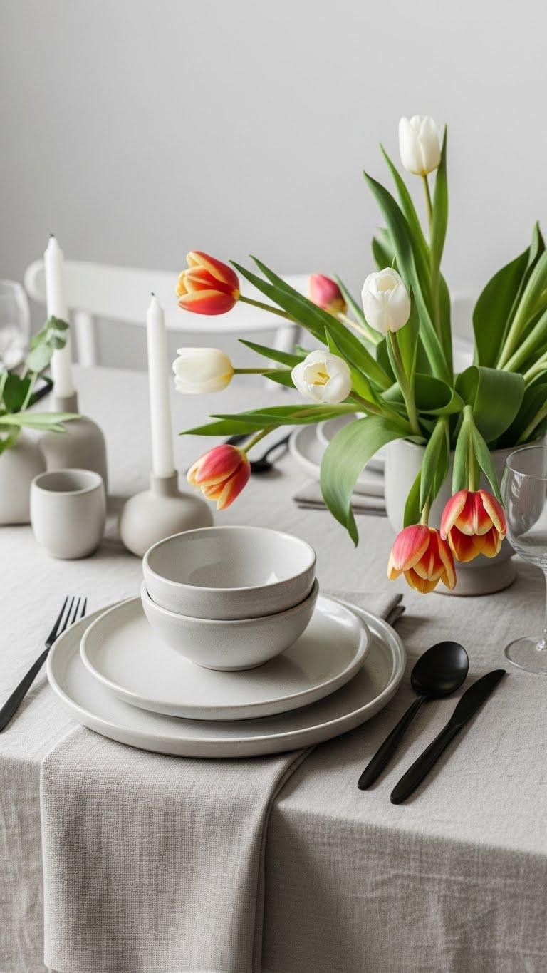 Set a serene spring scene by arranging a neutral tablescape anchored with a simple vase of tulips; the blooms bring instant freshness while keeping the look understated. You’ll layer neutral linens, textured dishes and matte flatware, then tuck tulip stems casually into a low ceramic vessel. Keep accessories minimal so guests feel relaxed, free to linger and savor simple, elegant farmhouse charm.