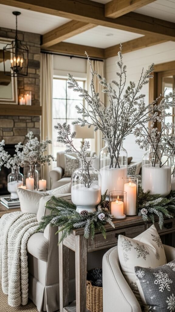 You can fill glass vases with faux snow, tuck in flocked branches, and add simple candles for soft glow.