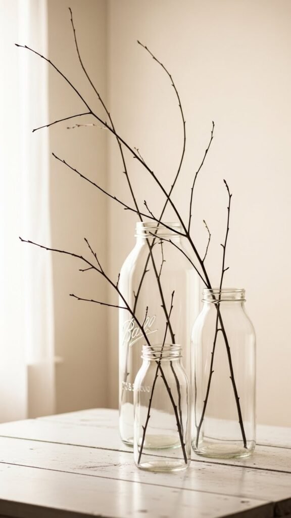 If you enjoyed the organic look of pinecones in sifters, try echoing that natural feel with bare branches in tall mason jars to add vertical interest and clean lines. You’ll love how twig silhouettes create drama without clutter.