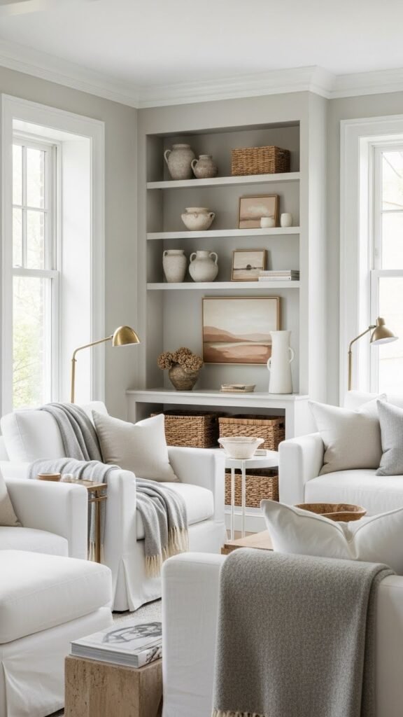 Light, layered neutrals anchored by crisp whites give your living room an instantly calm, farmhouse-ready feel without looking flat.