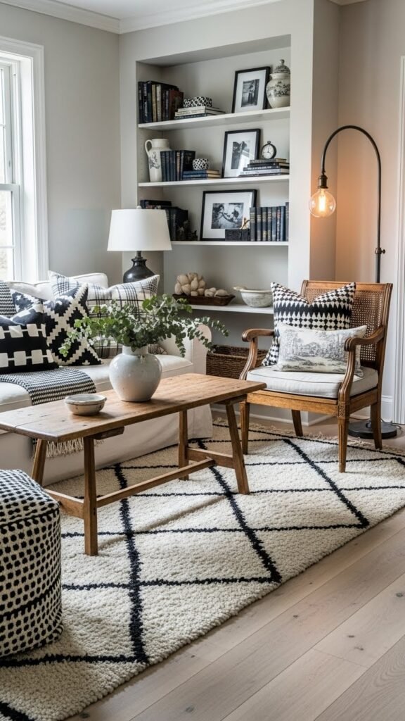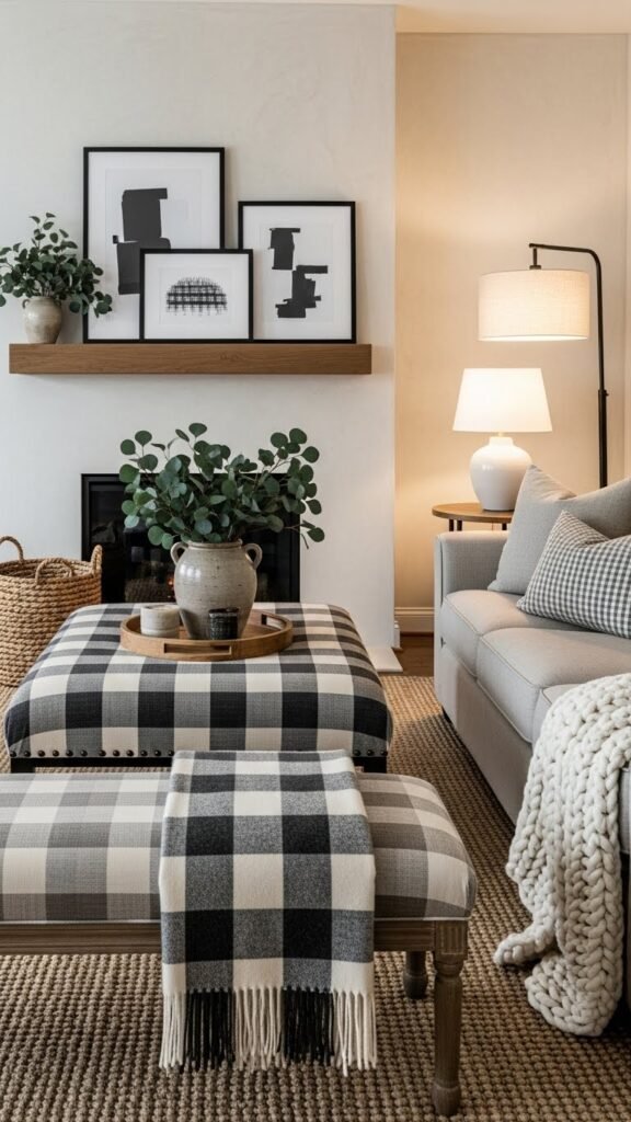 Bring buffalo check throws into your space to get that classic farmhouse look without leaning on holiday red and green. You’ll mix muted blacks, grays, and creams across sofas and a plaid bench to stay modern and free.