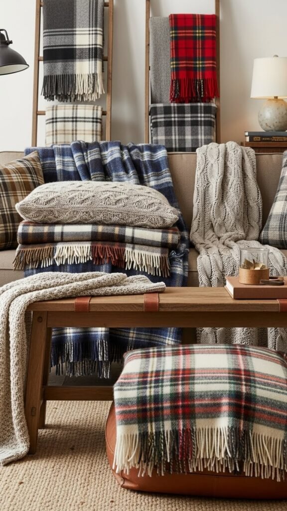 Drape throws casually over a check ottoman or ladder; they add texture, warmth, and effortless style without feeling seasonal or confining.