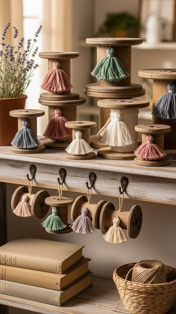 Tie playful tassels onto repurposed wood spools to give them fresh personality and farmhouse charm. You’ll love adding mini tassels in muted tones for subtle contrast, knotting them confidently so each piece feels intentional. Use them as spool charms on shelves, mantels, or hung from hooks. They’re affordable, portable, and effortless—perfect for expressing a free, cozy aesthetic without fuss.