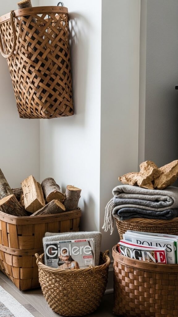 You’ll use tobacco baskets for kindling storage, blankets, or magazines, keeping things tidy and free. Mount one wall mounted for vertical interest, or cluster varied sizes for an effortless, liberated vibe that’s both practical and on-trend.