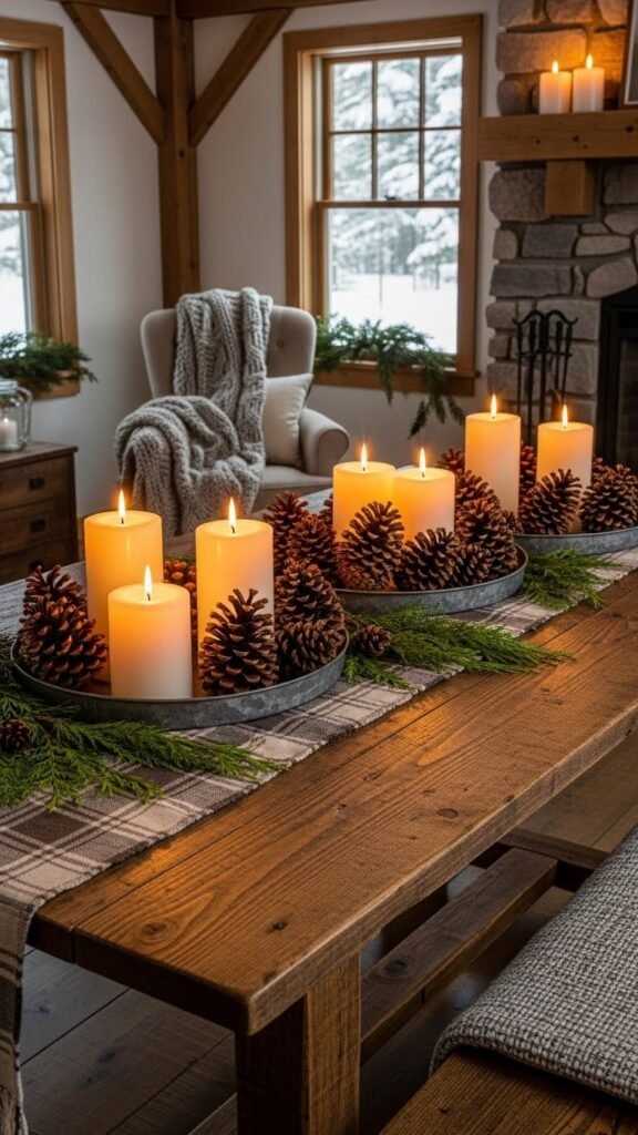 After you’ve corralled blankets and kindling in tobacco baskets, bring glow and texture to the room with flicker candles and pinecone candlescapes. You’ll create simple flicker arrangements on trays, pairing LED candles with clustered pinecone centerpieces and sprigs of evergreen. They feel cozy, low-maintenance, and free-spirited—perfect for a farmhouse that values warmth without fuss.