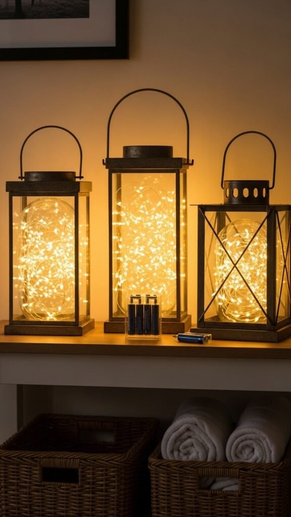 Weave a strand of tiny twinkle lights into a trio of varying lanterns to instantly add warm, understated sparkle to a shelf or entry table. You’ll love the soft lantern glow that feels both modern and lived-in. Choose battery twinkle strings for flexibility, tuck batteries discreetly, and mix heights and finishes so the display feels free, effortless, and inviting.