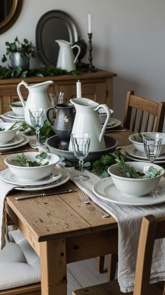 You’ll layer aged ironstone bowls, pitchers and platters with soft linens and greenery, letting patina accents tell stories without shouting.