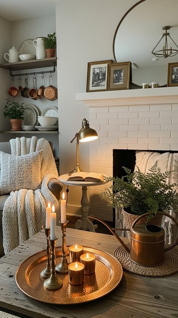 Bring in vintage brass and copper to warm up your farmhouse with metallic glow that feels lived-in, not flashy. You’ll mix patina polish with raw shine—let pieces age naturally or buff selectively. Use hammered trays as catchalls, candle bases, or layered on mantels. They add freedom-friendly charm, practical sparkle, and a modern-vintage vibe without feeling staged.