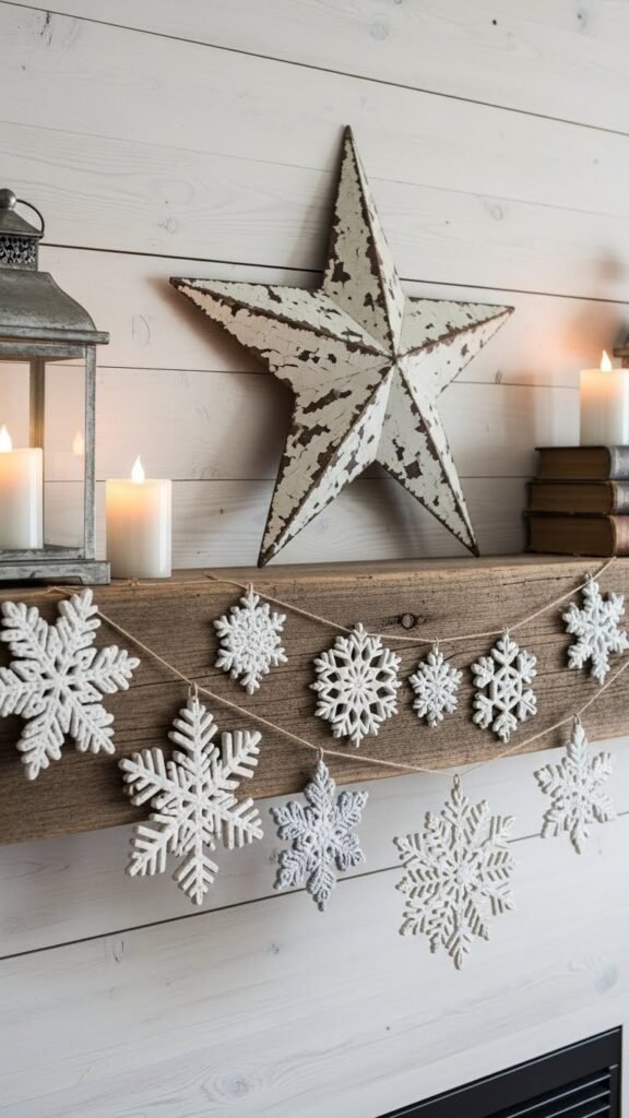 Dress up your mantel or staircase with distressed wood snowflake garlands to add quiet, rustic charm that feels both seasonal and timeless. You’ll string varied snowflakes against a shiplap backdrop, mixing worn whites and soft grays. Pair with a faded barn star for focal interest, keeping arrangements loose so your space breathes—effortless, on-trend, and ready for relaxed winter living.