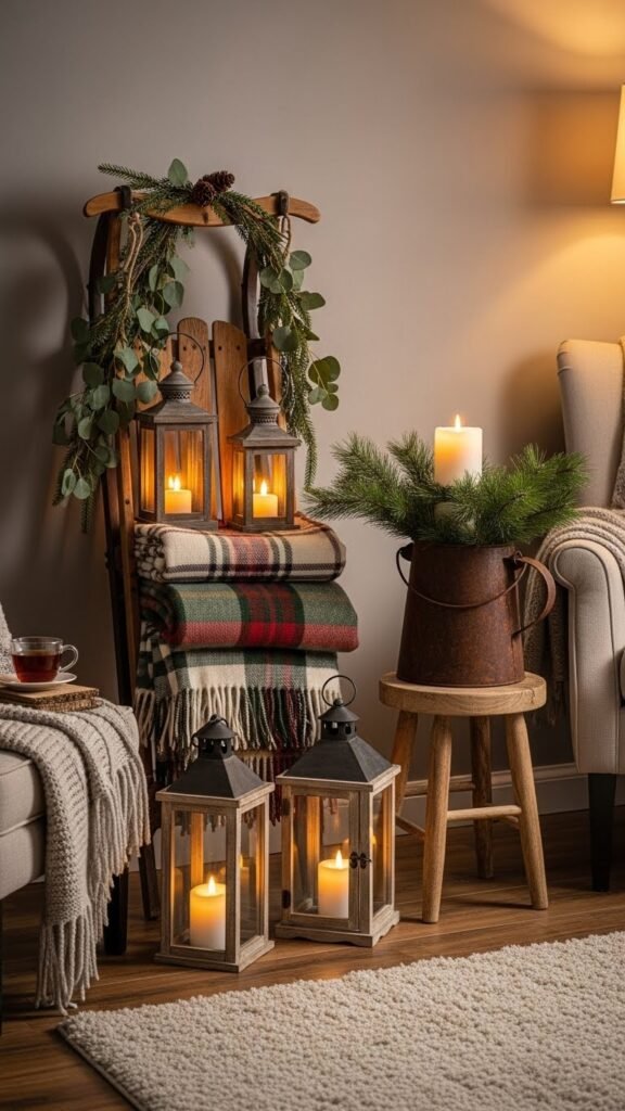 Anchored against a wall or leaning by the hearth, a vintage wooden toboggan instantly sets a cozy, nostalgic tone while giving you a sturdy display surface for winter accents. Use an antique toboggan as a low shelf, layering plaid throws, lanterns, and greenery.