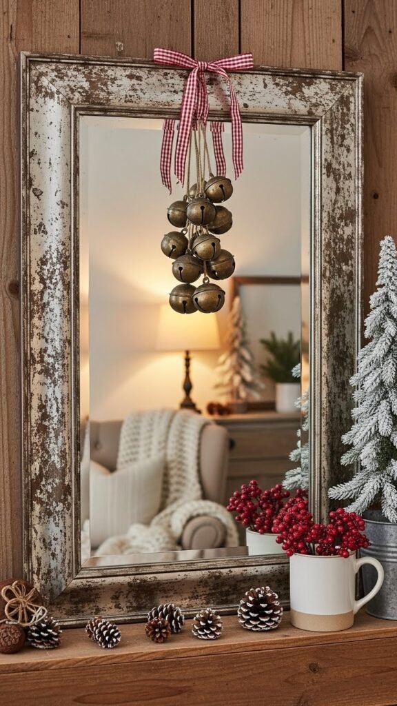 Bring an antique mirror into your winter vignette and let its aged glass double your room’s glow while adding a hint of holiday cheer. You’ll pair the mirror’s weathered patina with simple ribbon accents and a clustered sleigh bell for sound and movement. Hang it where light bounces; it frees your space, feels curated, and keeps farmhouse charm effortless and joyful.