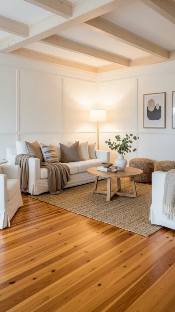 When you pair warm wood tones with crisp white hues, you get a layered, comforting look that feels both timeless and fresh; the wood’s natural grains add depth while white keeps the room bright and airy. Let honeyed oak floors anchor spaces, maple beams draw the eye upward, and alabaster trim with dove white walls create a calm, liberated backdrop you’ll love.