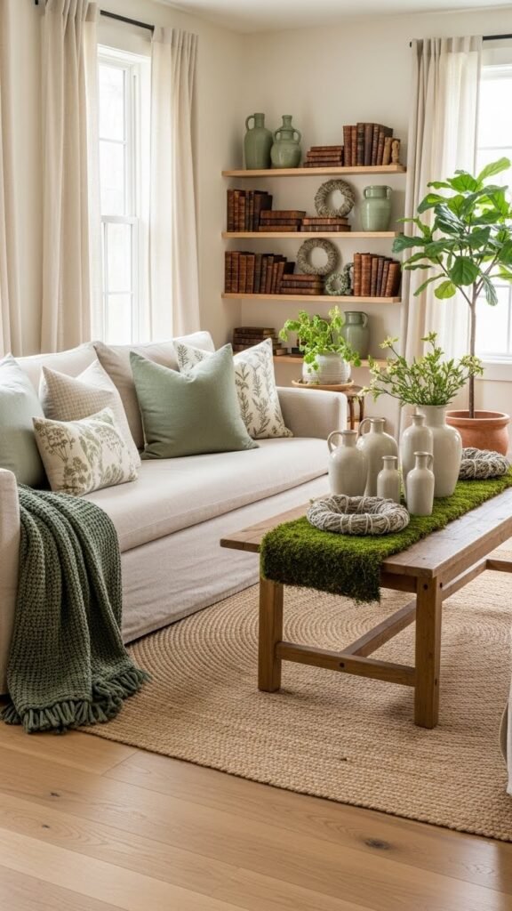 A few subtle green accents can instantly ground a neutral farmhouse palette and make the room feel more intentional and lived-in. You’ll layer sage accents—think ceramic vases, pillows, and small wreaths—to add calm without overpowering white and wood.