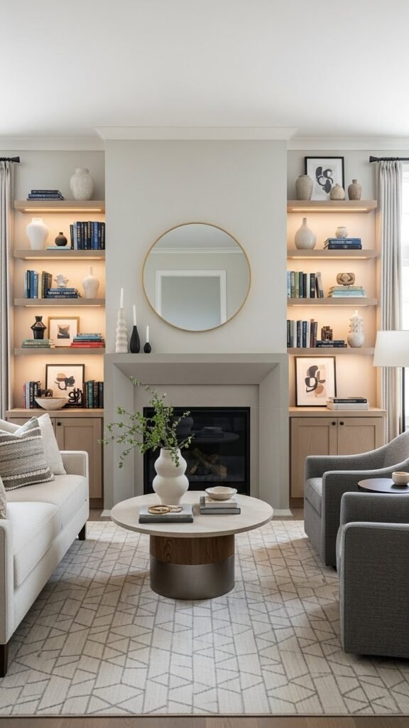 Flank your fireplace with built-in shelving to frame the hearth and create a streamlined stage for curated displays. You’ll arrange curated vignettes—books, art, objects—with breathing room, balancing scale and texture. Install adjustable lighting to spotlight favorites and shift mood.