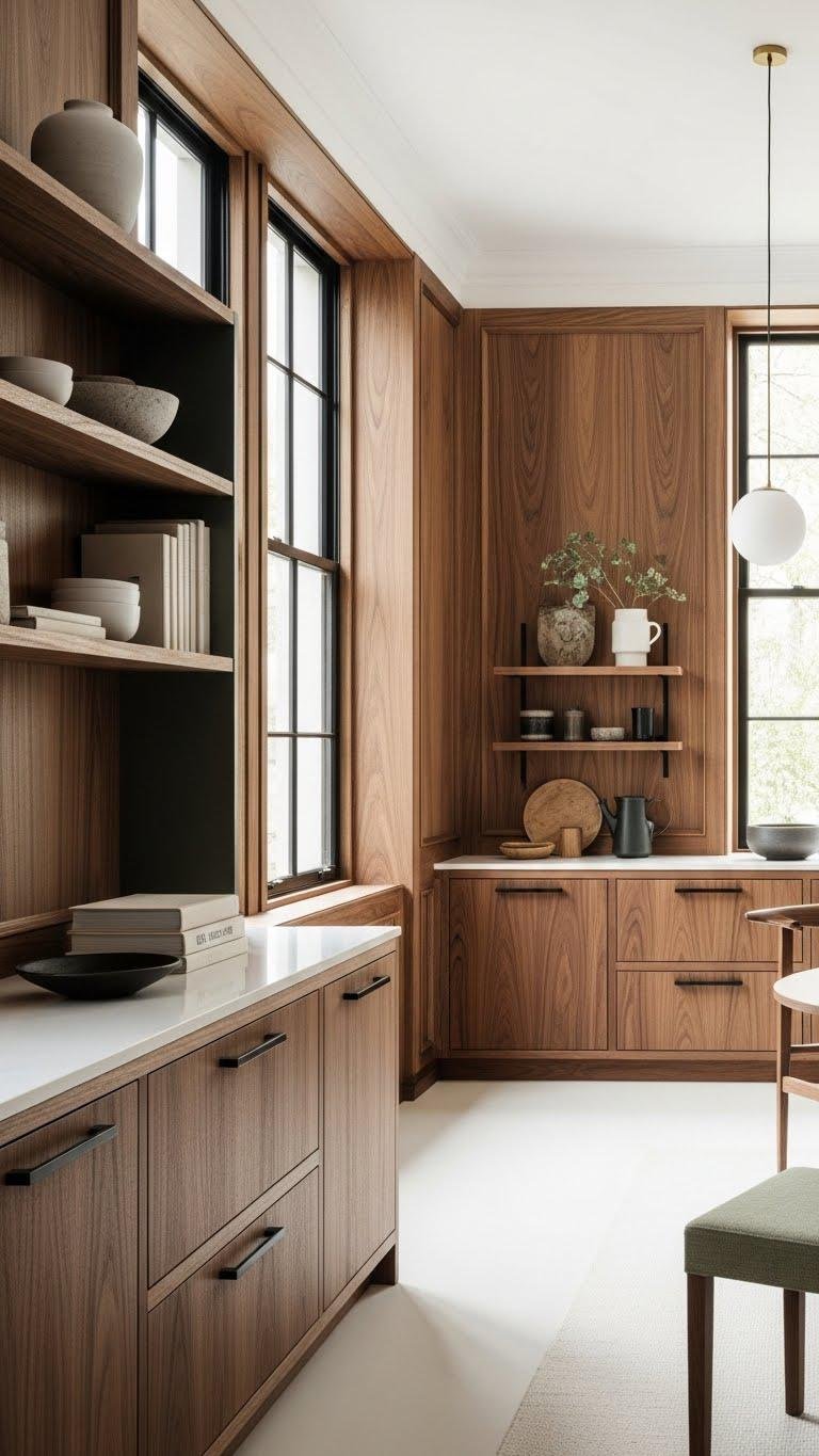 When you choose rich wood cabinets and paneling, you instantly anchor a room with warmth and timeless sophistication; deep grains and tonal variation give depth that paint can’t match. You’ll love walnut paneling for its modern resilience and mahogany grain for classic drama. Pair them with matte hardware, open shelving, and generous light to keep spaces airy, liberated, and unmistakably refined.