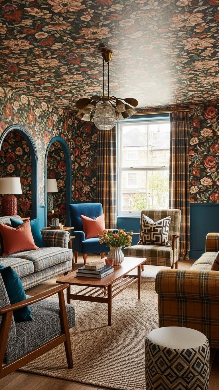 Embrace bold wallpaper across an accent wall, ceiling, or nooks, then balance scale with plaid upholstery on sofas or chairs.