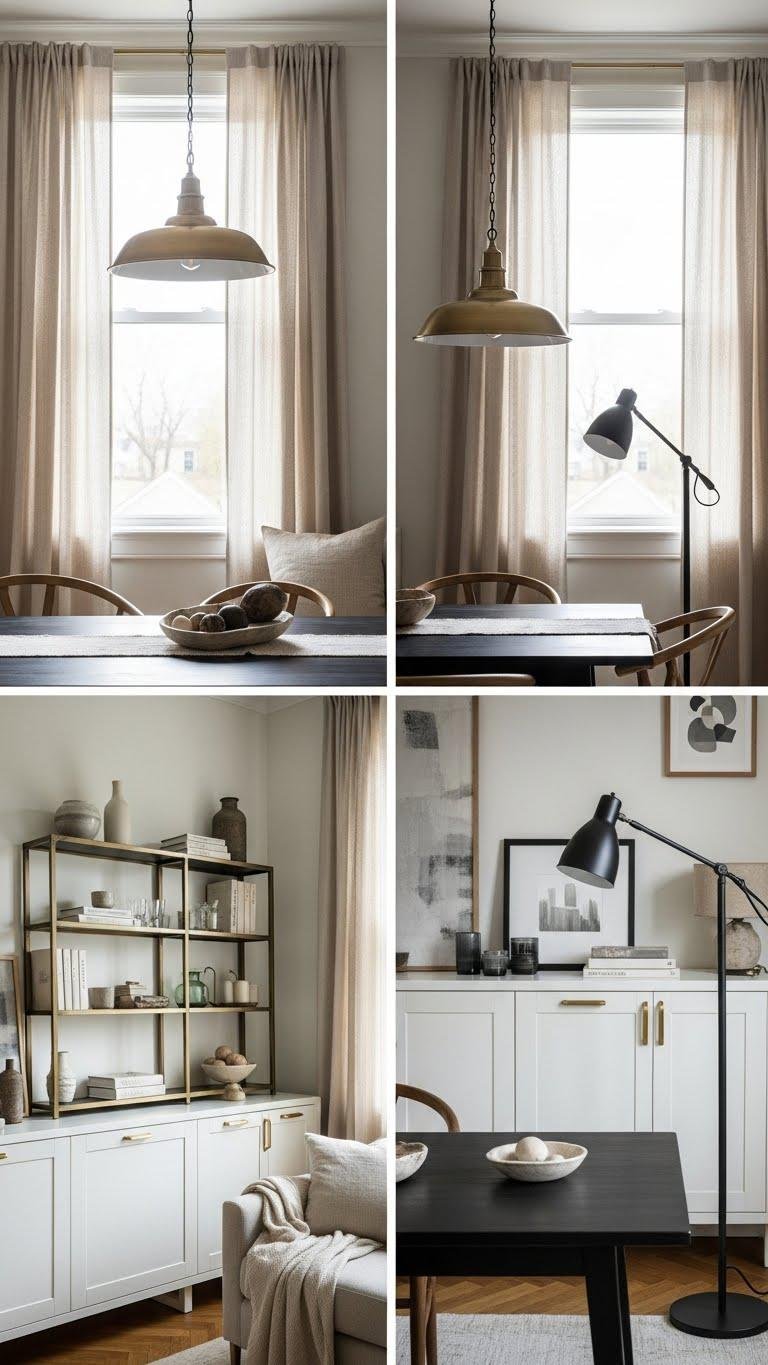 After framing windows with soft linen tiers, you can carry that warm, lived-in feeling into the rest of the room by mixing metals—letting brass accents anchor fixtures while cooler finishes add contrast.