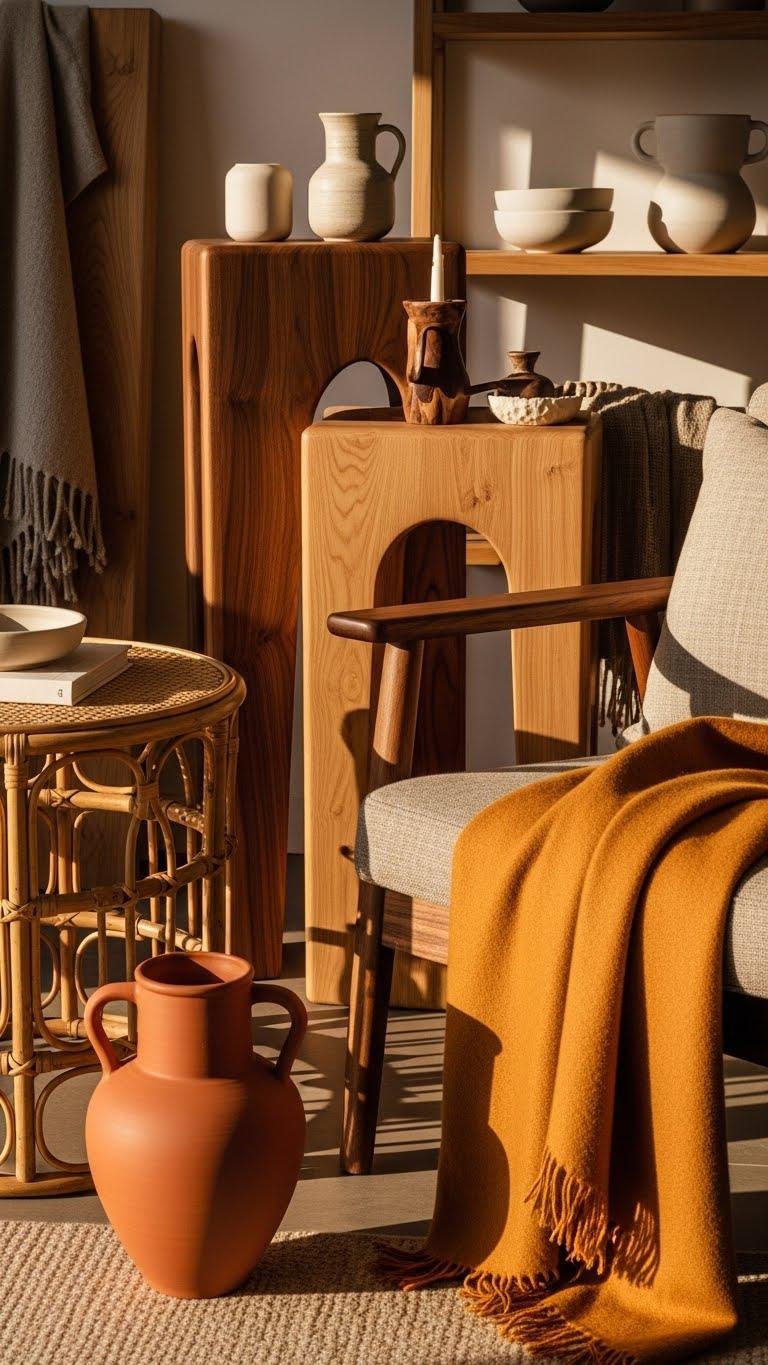 Pull a sun-warmed terracotta or buttery ochre into your scheme and let wood do the heavy lifting: walnut, oak, and rattan add tactile depth while tying warm earth tones to natural texture. You’ll lean into Sunset ochre and Walnut warmth, balancing neutrals with sculptural timber pieces, cozy textiles, and matte ceramics so your space feels liberated, grounded, and effortlessly curated.