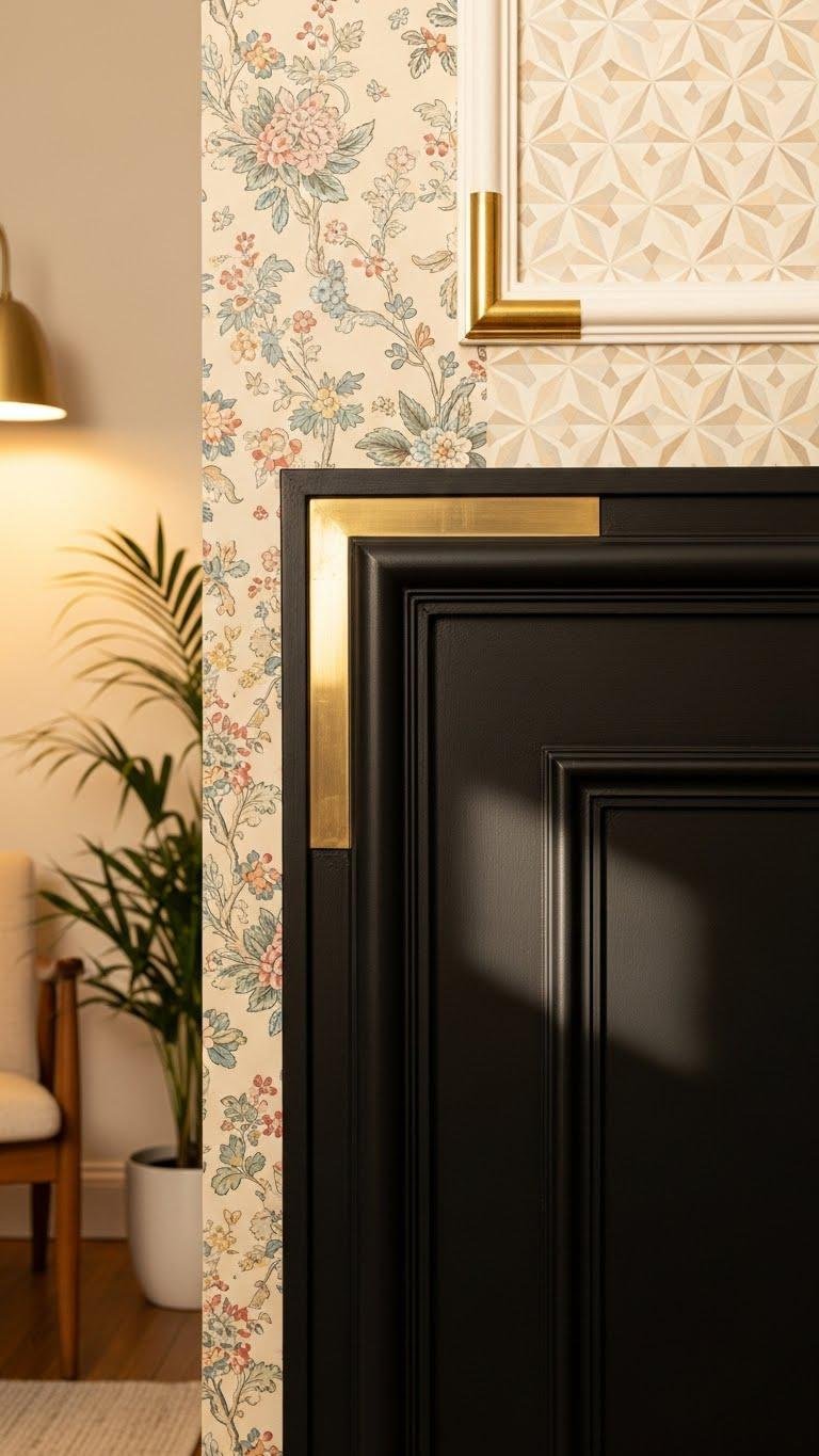 When you edge patterned wallpaper with a high-contrast trim, you sharpen the room’s composition and give busy prints a purposeful frame. You’ll use bold borders to anchor florals or geometrics, directing the eye and adding modern edge. Try eclectic trims—mismatched profiles, metallic accents, or painted contrasts—to express freedom and confidence while keeping pattern playful, intentional, and clean.
