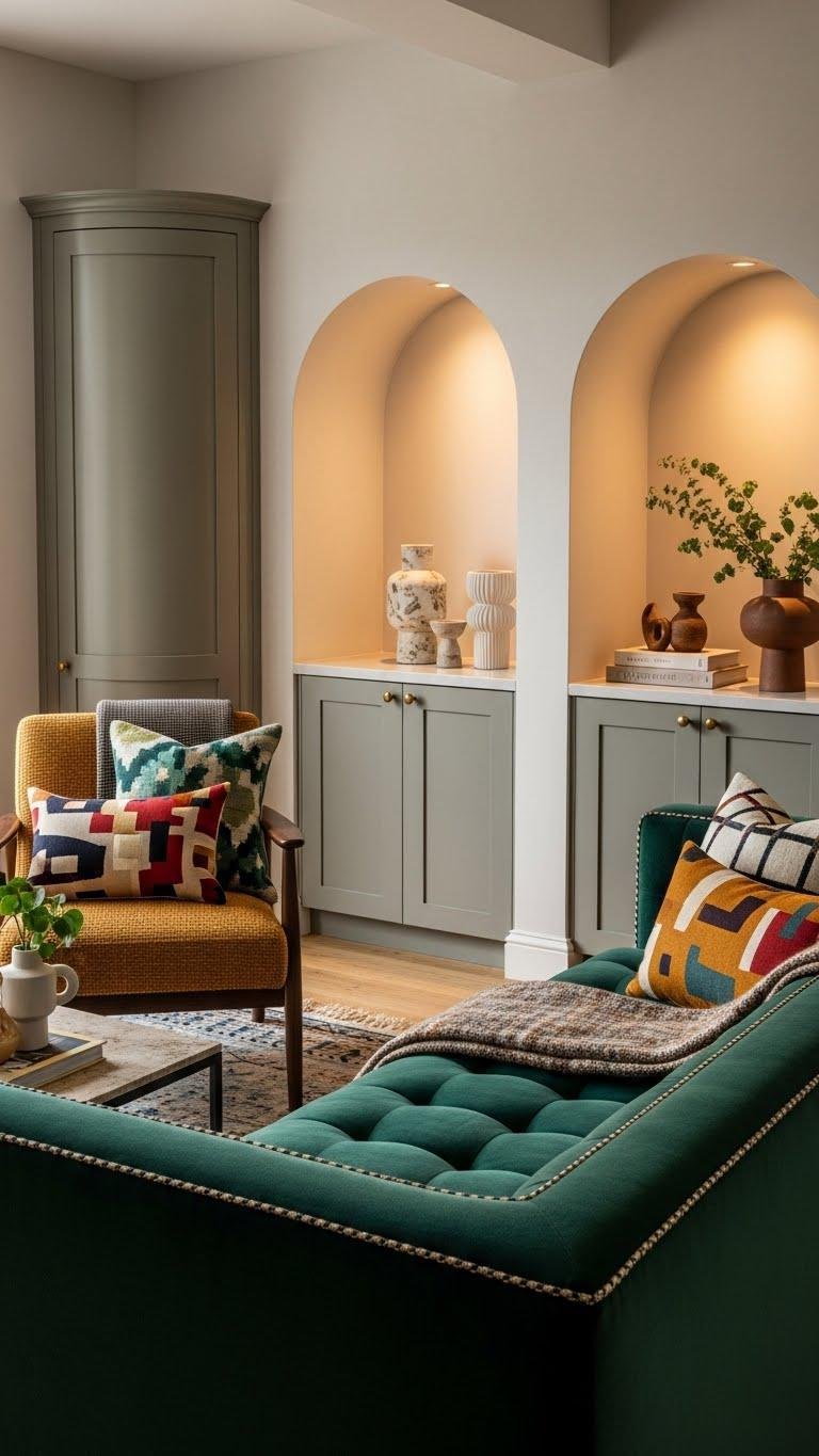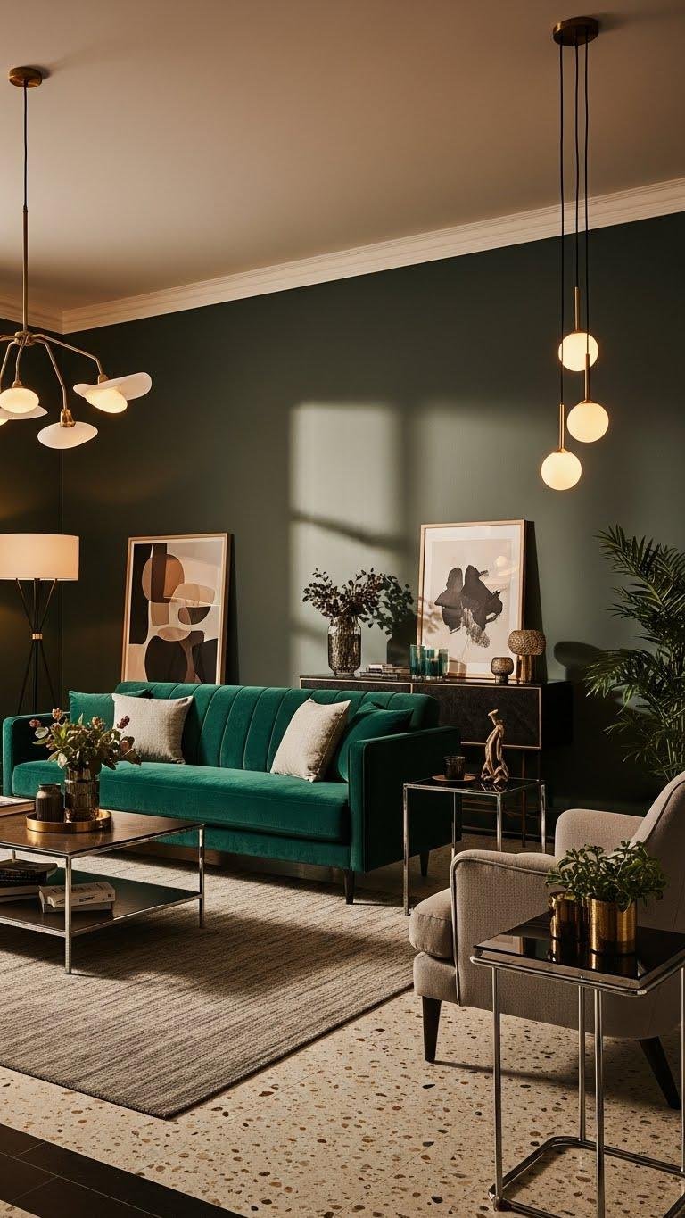 If you want a room that feels both grounded and theatrical, deep green accents deliver instant drama without overpowering the space.
