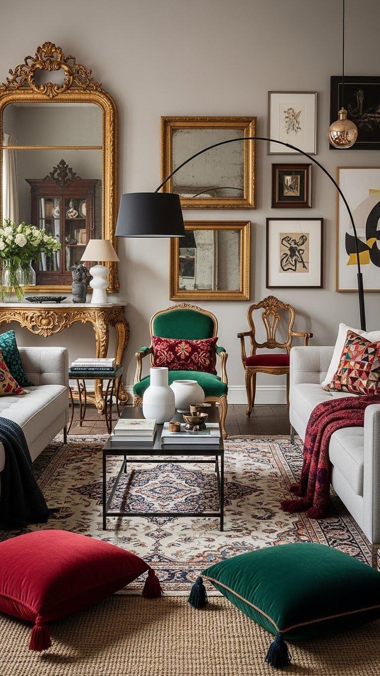 Combine ornate mirrors, sculptural lighting, and streamlined sofas; mix patterns sparingly, anchor with a neutral base, and trust your instincts to craft a liberated, cohesive space.