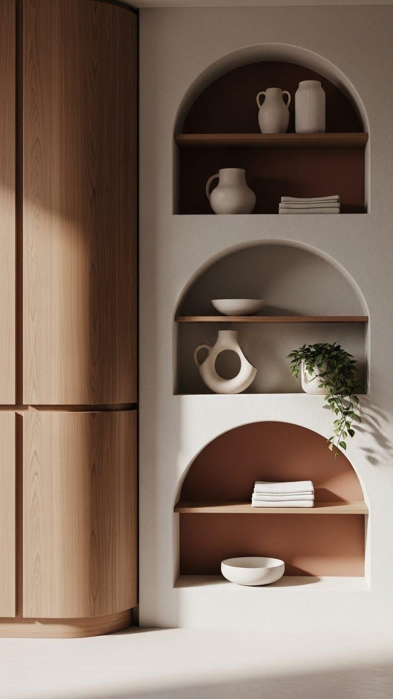 When you swap rigid lines for gentle curves, cabinetry and arched shelving niches soften a room’s geometry while adding unexpected sculptural drama. You’ll choose curved cabinetry to encourage flow, erase boxy constraints, and showcase objects in a more organic way. Arched niches create intimate vignettes, play with shadow, and let you express a liberated aesthetic without overwhelming the space. Simple, bold, deliberate.