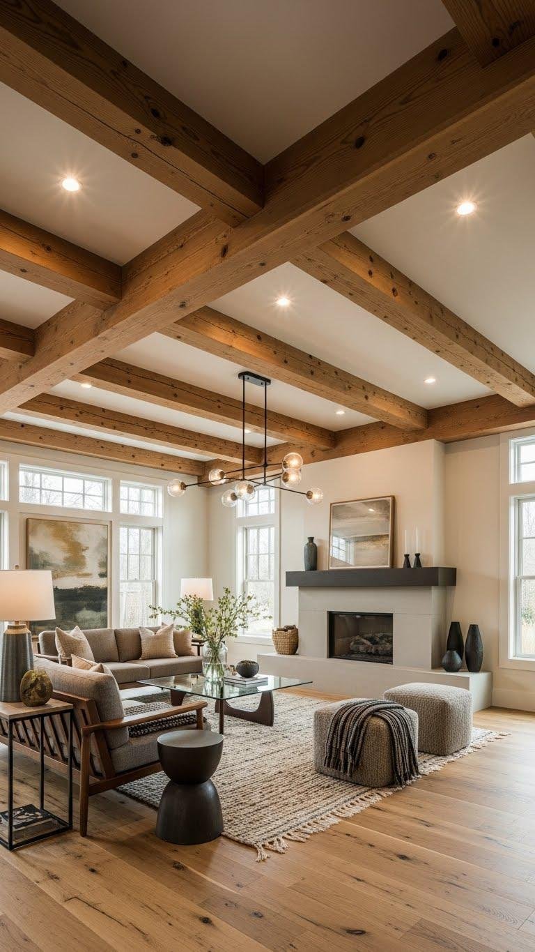 Beams bring instant character and scale to a room, so think of exposed wood as both structure and style—anchoring your living space while guiding sightlines and light. You’ll balance rustic contrast with sleek furnishings, layer textures, and choose finishes that free your aesthetic. Integrate beam lighting for drama and function, hang fixtures or recessed spots, and let the beams dictate rhythm and openness.