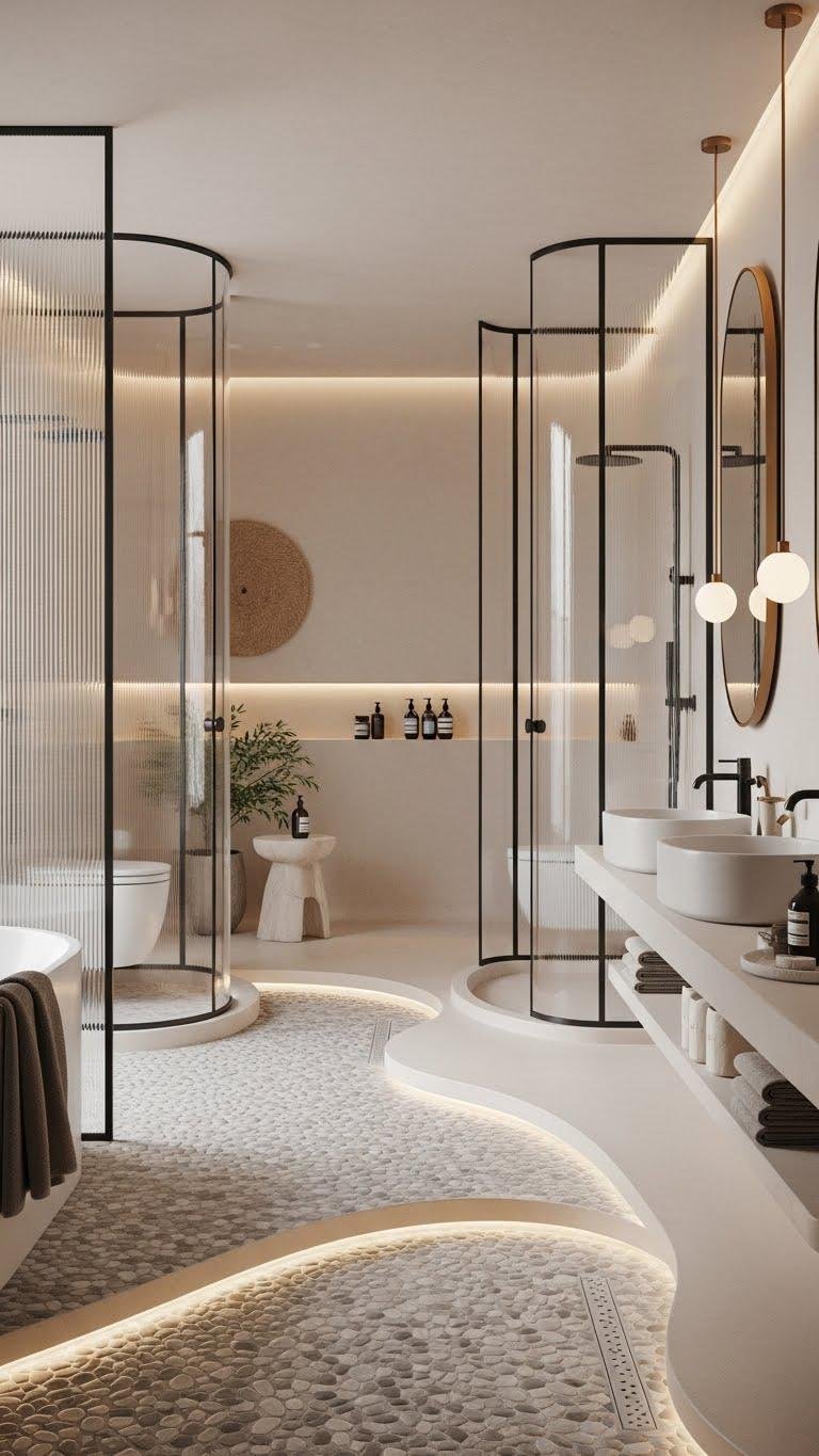 When you trade rigid lines for flowing curves, a shower room becomes a spa-like wet room that feels both modern and instinctively calming. You’ll embrace curved glassways to define zones without confinement, pairing them with pebble flooring for tactile grounding and natural drainage. Keep fixtures minimal, finishes matte, and lighting warm—so you cultivate a liberated, sculptural bath space that prioritizes movement and calm.