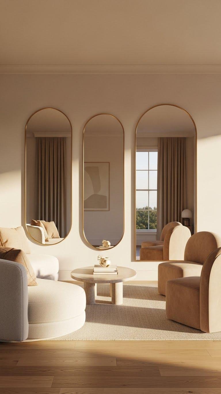Pair curved seating with oblong or arched mirrors to amplify those soft silhouettes and bounce light into the room. You’ll create airy, liberated spaces by positioning mirrors to catch natural light and frame vistas.