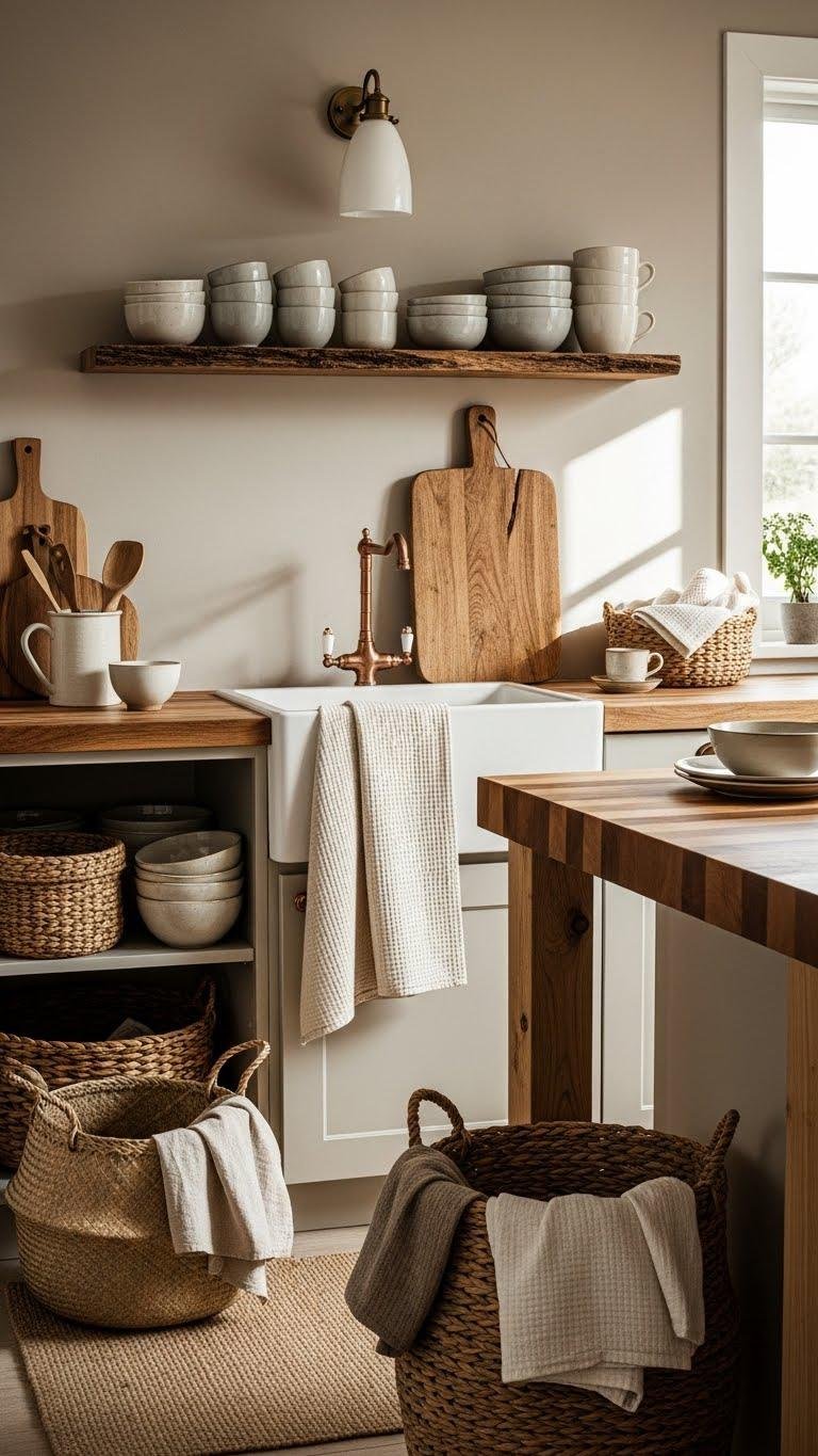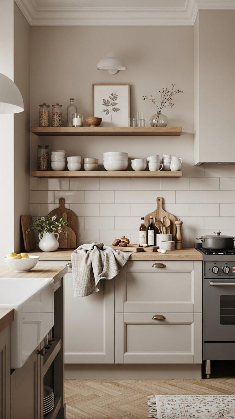 You’ll favor muted neutrals—creamy beiges, soft greys—paired with woodgrain warmth from butcher block or open shelving.