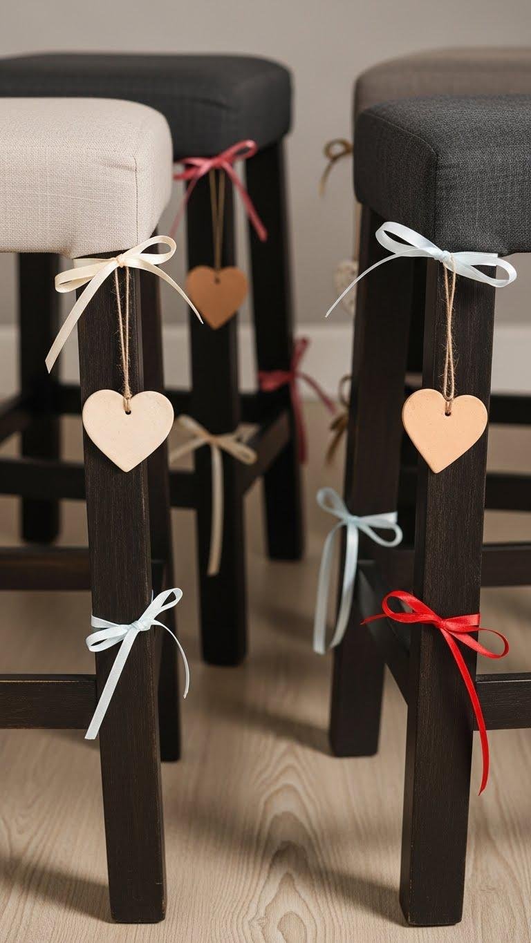 Dress your stools with simple ribbon ties and petite clay hearts to give seating a handmade, seasonal touch that’s easy to change after the holidays. You’ll secure ribbon garlands around legs, knotting neatly; attach clay tags or hearts with twine for a rustic, removable accent. Keep colors neutral or bold for contrast, and swap pieces quickly to suit mood or season.
