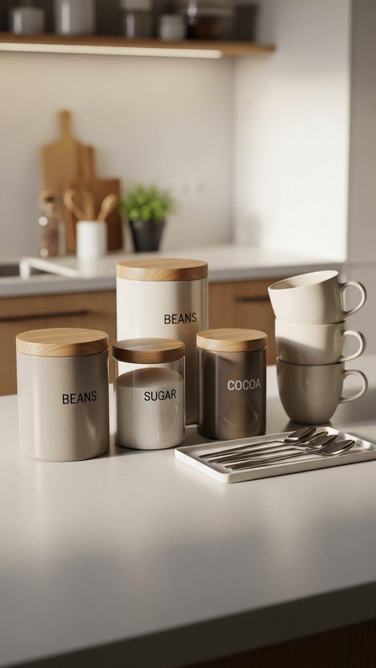 Often you’ll find that a dedicated coffee station becomes the heart of a chilly kitchen; start by choosing neutral canisters in varying heights and textures to keep things visually calm yet interesting. You’ll arrange labeled canisters for beans, sugar, and cocoa, pair them with minimalist mugs, and tuck a small tray for spoons. The result feels organized, liberating, and inviting.