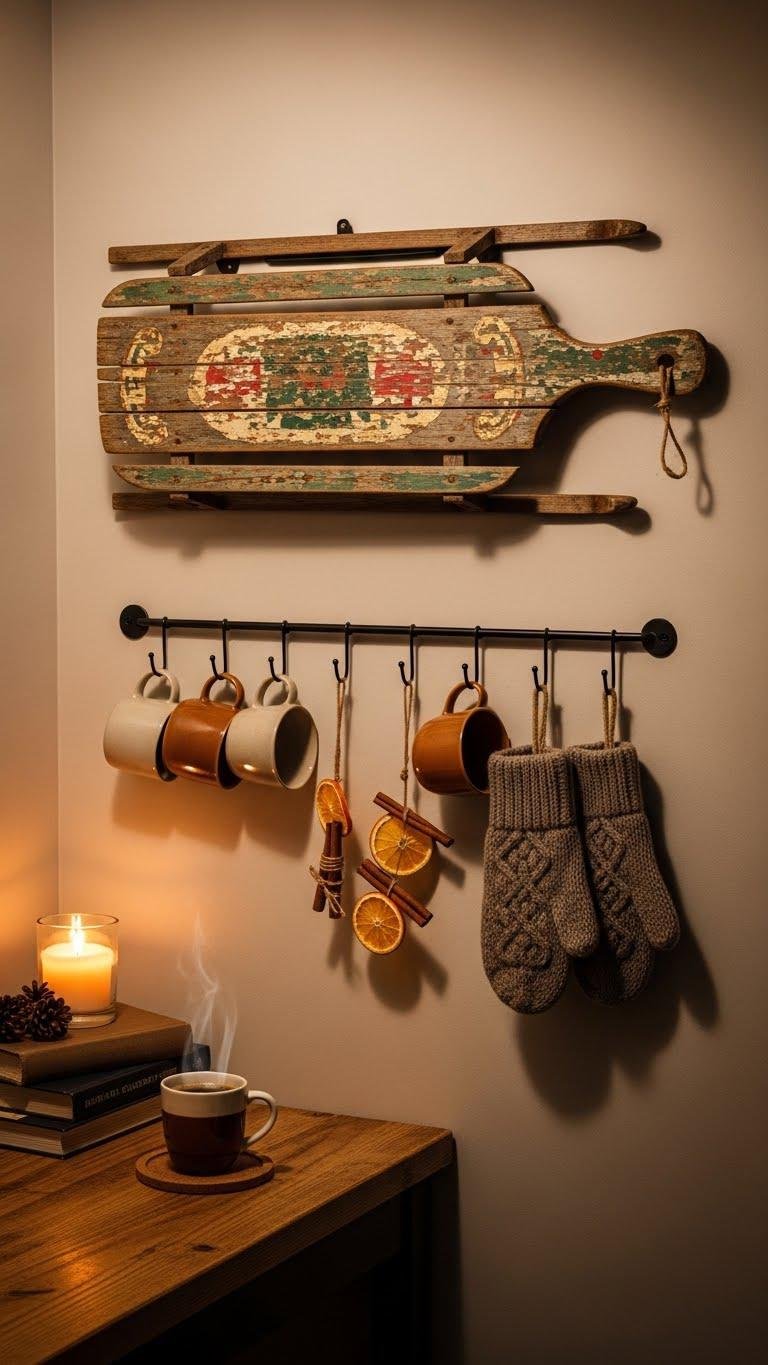 After you’ve set up a warm coffee corner, bring that same cozy, organized feeling up onto the wall by hanging a sleigh serving board or a curated wall hook display. Choose a weathered vintage sleigh board as focal art, then add a minimalist metal hookwall for mugs, mittens, or garlands. You’ll gain practical storage with liberated, effortless style.