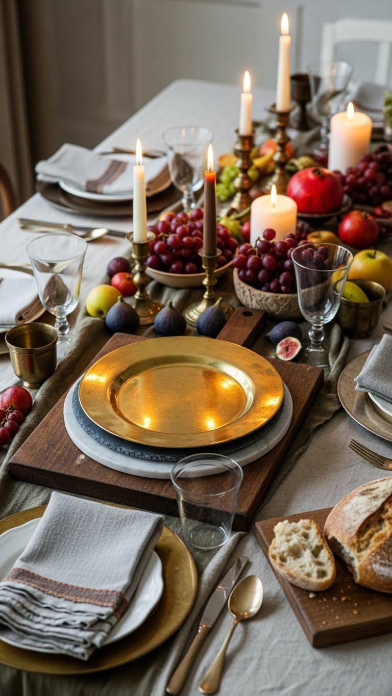 Start with a sturdy wooden board as your base and layer a smaller marble or slate piece on top, then finish with a polished brass charger to add warmth and shine. You’ll pair antique chargers with textured, layered linens for contrast, arranging seasonal fruit, candles, or bread. Keep placements loose and functional so guests can help themselves and you retain effortless, liberated style.