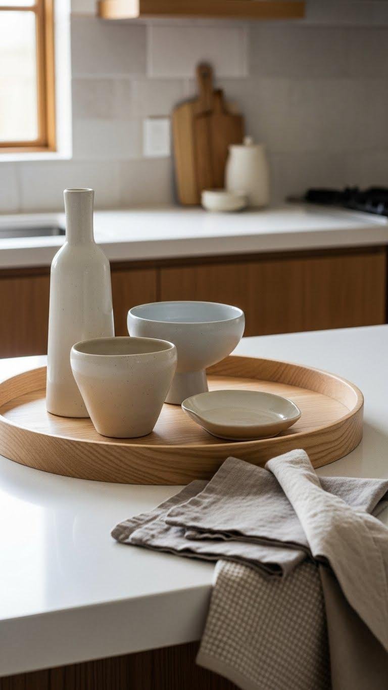 Once your table feels warm and lived-in from layered boards and brass chargers, carry that same relaxed polish to a simple neutral countertop vignette. You’ll arrange a minimalist vignette on a wooden tray, group a ceramic trio for height, and tuck soft linens nearby. Keep colors muted, materials tactile, and leave breathing room so the space feels open and free.