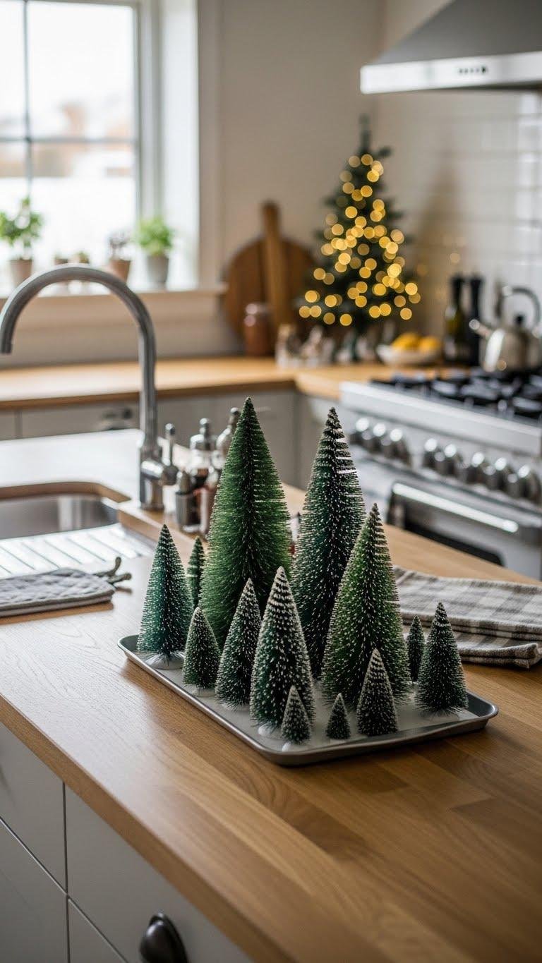 Bring out those little Christmas village trees and let them do double duty on your kitchen counters this winter. You’ll arrange a miniature forest group near the sink or stove, mixing heights for rhythm. Anchor it with a low tray so it reads as a purposeful countertop centerpiece. Keep surrounding surfaces clear, rotate pieces for fresh energy, and enjoy uncluttered, liberated warmth.