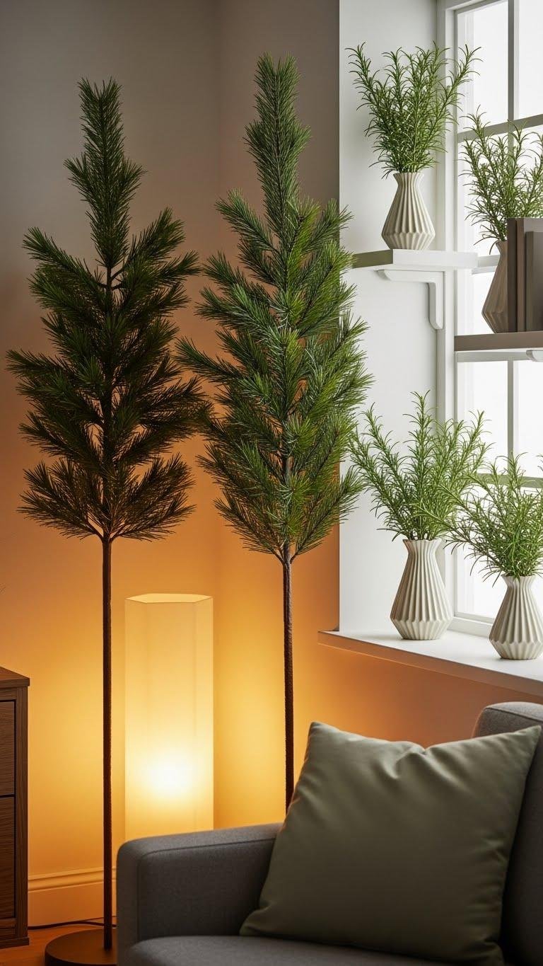When you tuck faux pine and rosemary sprigs into corners, they lift the room’s energy without needing constant care; place taller faux boughs near floor lamps to catch light and tuck short rosemary sprigs into small vases on shelves or windowsills for a fresh, textured contrast.