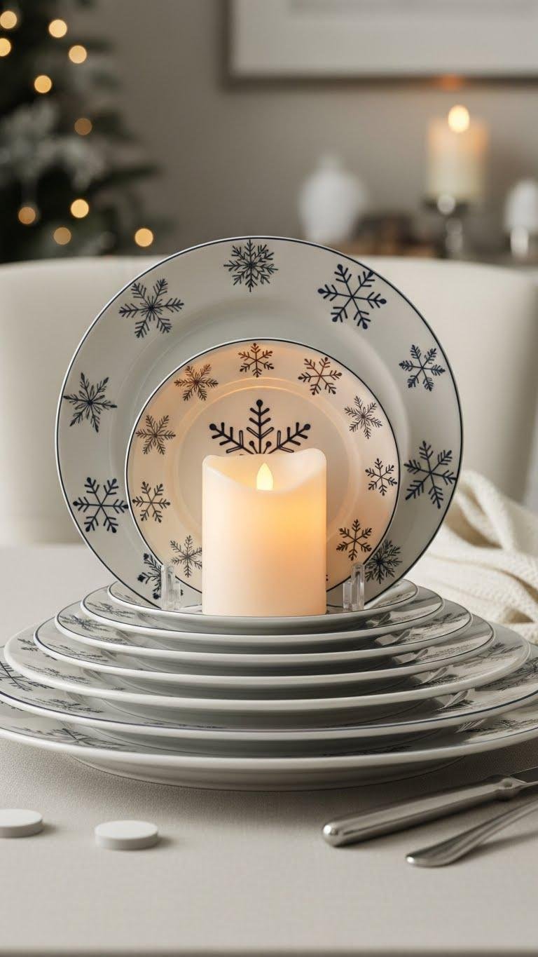 Layer snowflake plates into a petite tower and tuck a battery candle into the center to create an instant winter vignette that’s safe, low-maintenance, and surprisingly chic. You’ll use dinnerware layering to build height and texture, anchoring a simple candle centerpiece that’s portable and spill-free. Arrange varying sizes, secure with a non-slip pad, and let the scene feel effortless and liberating.