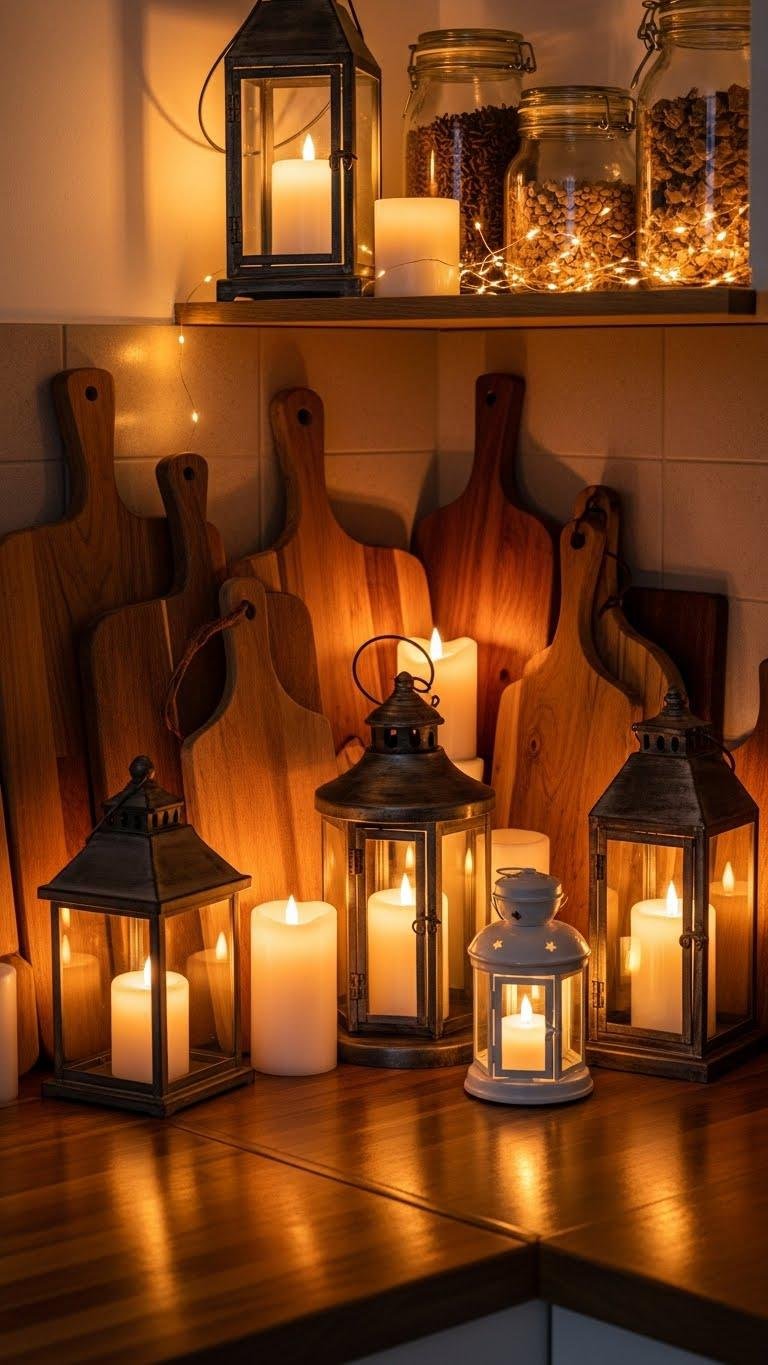 After you’ve arranged your cutting boards to warm up the backsplash, layer in soft lighting to make the whole vignette glow.